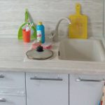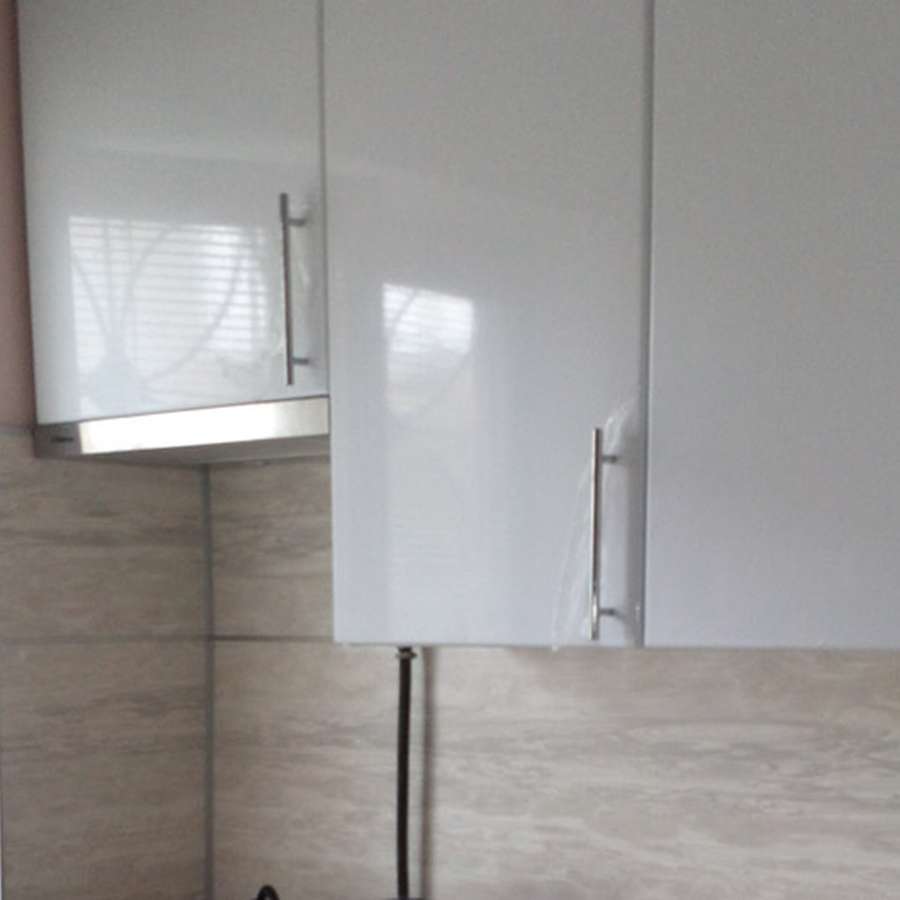 Кухня прямая, размеры: 2200*600*2400, корпус ЛДСП 16мм — белый, фасады МДФ 16мм белый ультра глянец, столешница влагостойкая 38мм и стеновая панель 6мм (Россия) – олива жемчужная, фурнитура без доводчиков (кромке тумбы под мойку и сушки), мойка иск. камень, сушка хром.
