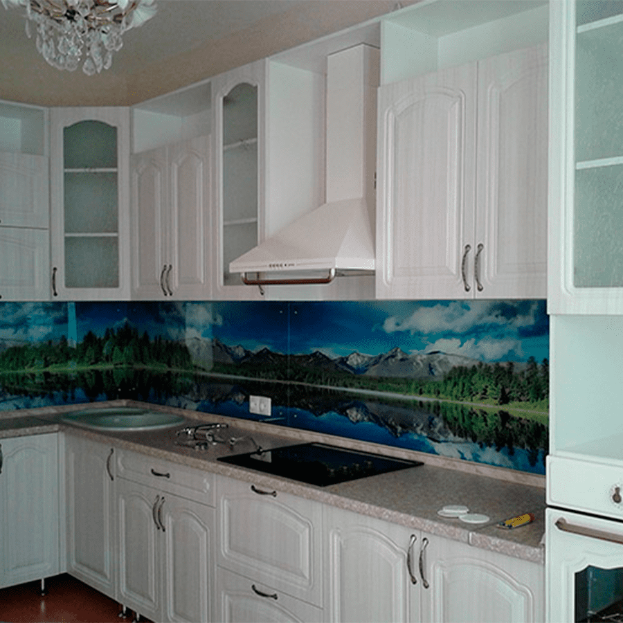 Кухня угловая, размеры (мм): 3780*1530*2410, фасады МДФ 16мм с фрезеровкой – сандал белый, столешница влагостойкая 38мм (Россия) – колорадо, стеновая панель – стекло закаленое 5мм с фотопечатью, мойка искусственный камень, метабоксы Blum, петли с доводчиком Blum (Австрия), сушка нержавеющая сталь 700мм.