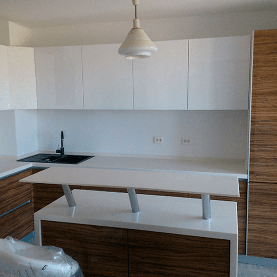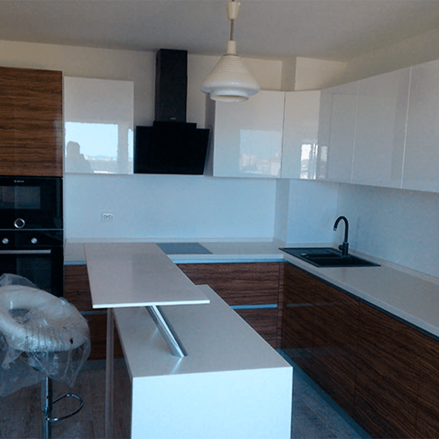 Кухня угловая, размеры: 3600*2900*2170, корпус ЛДСП 16мм, фасады пластик Alvic олива глянец + бланко глянец, столешница 40мм искусственный камень Samsung, мойка врезная искусственный камень, фурнитура Blum c доводчиками и без доводчиков. Остров с барной стойкой – искусственный камень, фасады Alvic.