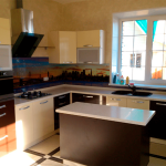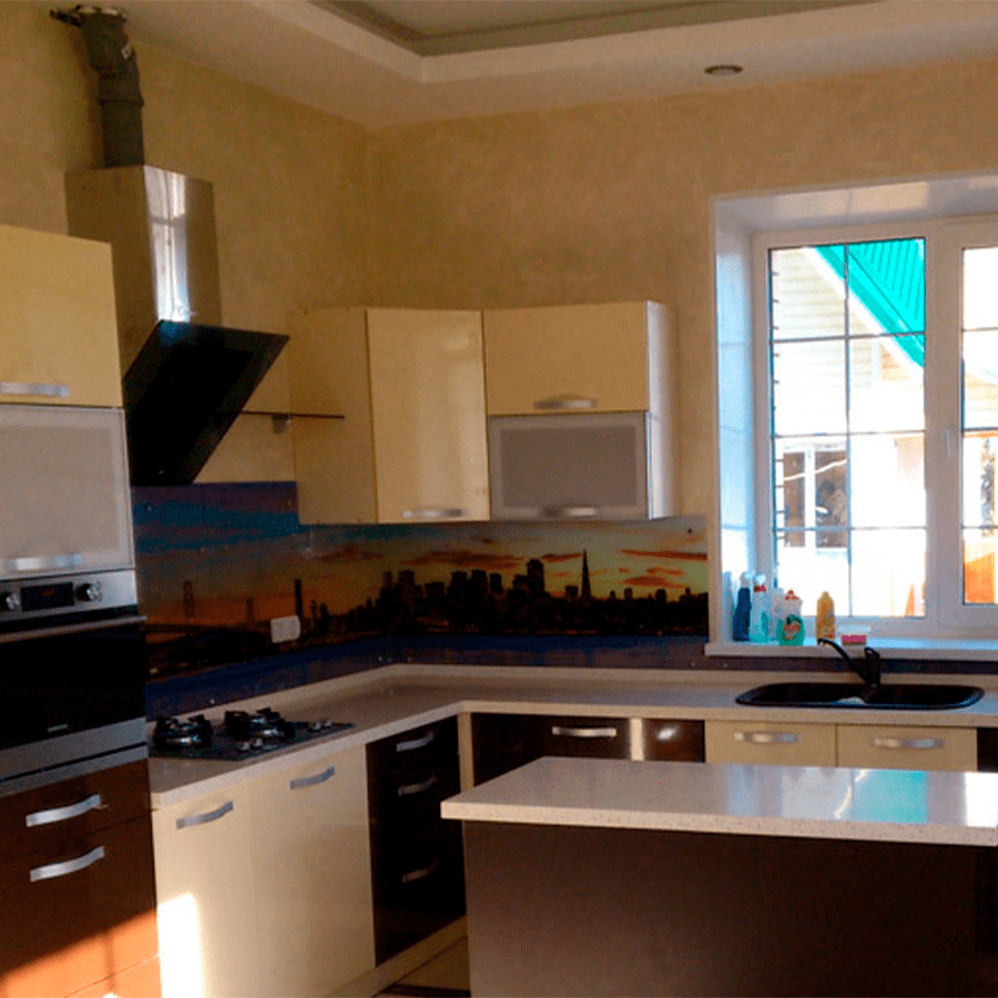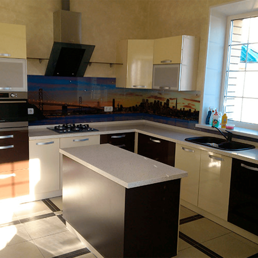 Кухня угловая, размеры: 2800*2750*2170, корпус ЛДСП 16мм – арабика+крем, фасады пластик в алюминиевой рамке – шоколад+ваниль глянец, столешница 40мм искусственный камень, мойка керамогранит, фурнитура Blum c доводчиками и без доводчиков, сушка хром, стеновая панель с фотопечатью на закаленном стекле 5мм.
